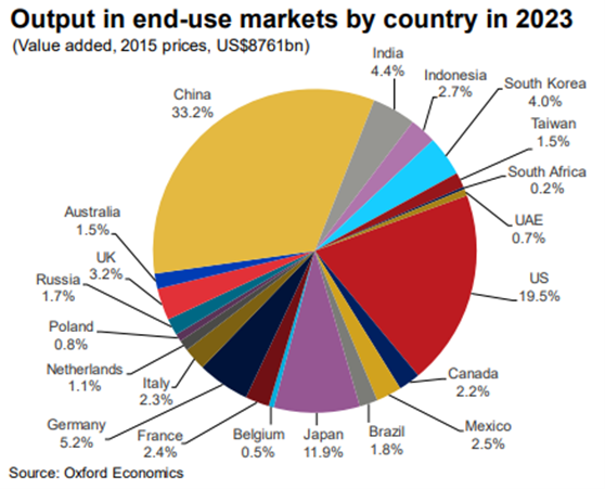 - In the following pie charts, output in end-use markets from 2022 to 2023 saw increases for China, India, US, Mexico, and the UAE. Europe’s output suffered as Germany, France, Italy, Russia, and the U.K. all shrank slightly.