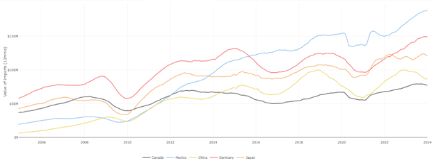 - Mexico’s increasing trendline could hint at success in the nearshoring movement over the years.